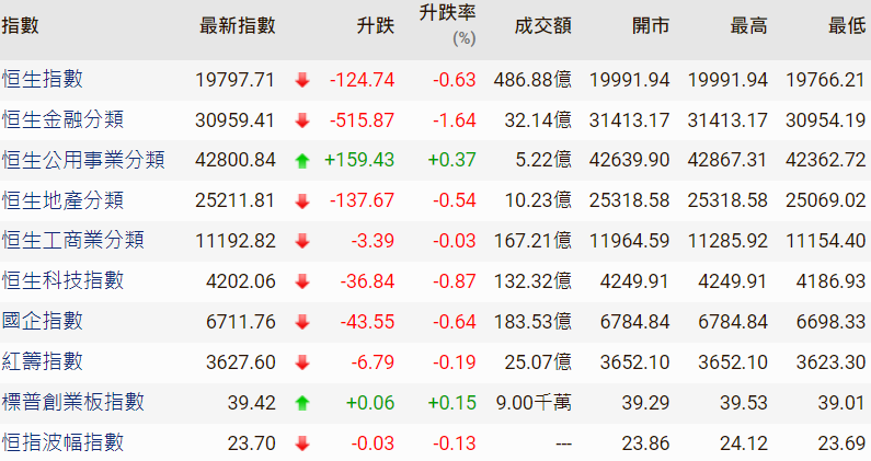 香港新聞網8月18日電 香港恆生指數18日中午收市跌124點或0.63%,報19797點,成交486.88億港元。