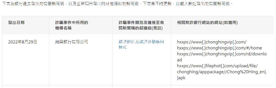 香港新聞網8月29日電 香港金融管理局(金管局)29日呼籲市民提高警覺,留意一個由創興銀行有限公司所發出關於欺詐網站及流動應用程式的新聞稿,有關銀行已向金管局匯報事件。連接至該新聞稿的超連結已上載於金管局網站。