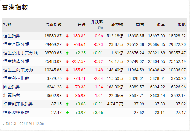 香港新聞網9月19日電  市場憧憬香港檢疫安排由“3+4”變成“0+7”,旅遊、零售相關股逆市向好。恒指半日跌180點或0.96%,報18580點,成交512億港元。