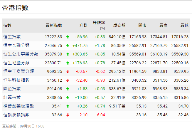 香港中通社9月30日電(記者 張明臻)香港恆生指數30日收升56點或0.3%,報17222點;大市成交額849億港元。恒指整個9月份累插2731點或13.7%。 當日,恒指平開報17165點,其後在緩步中曾稍上升179點至17344點,但在買盤態度保守下,大市未能作進一步推升,零碎沽壓再現,整個大市再見反覆,順勢再創月內及年內新低。午後大市止跌回升。