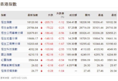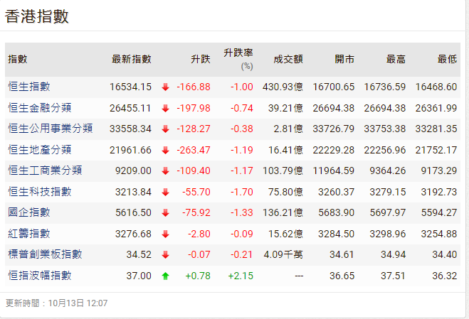 香港新聞網10月13日電  港股13日上半日反覆再跌逾百點。恒生指數半日跌166點,報16534點,成交430.9億港元。