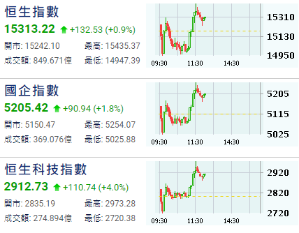 【港股半日速報】恆指半日升132點