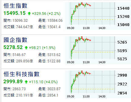 香港新聞網10月26日電 在科技股造好下,香港股市26日反彈,中午收市報15495點,半日升329點,成交744.64億港元。