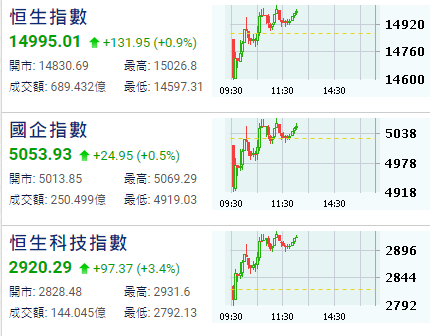 【港股半日速報】恆指半日升131點