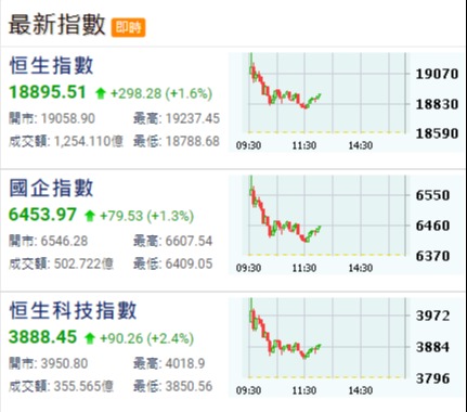當日,恆生指數低開172點,開報14859點,升幅隨即擴大,曾擴大至600點。