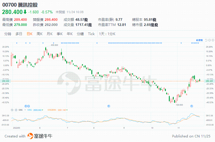 荷蘭子公司Prosus的資產淨值報表 圖源:Prosus官網 此前,在9月9日至10月28日的一個多月裡,南非Naspers集團曾暫停減持騰訊股票,期間騰訊股價仍跌超30%,至2017年初以來最低。截至本周四(24日)港股收盤,騰訊股價已較10月28日的階段低位反彈近40%。 11月24日,騰訊H股收於280.4港元/股,下跌0.57%,總市值2.69萬億港元,較10月28日的階段低位反彈近40%。