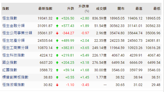當日,恒指高開150點,其後升幅逐步擴大,曾升最多591點,高見19406點。