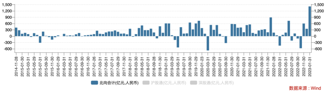 香港新聞網2月1日電 外資在A股創造了一項新的歷史紀錄。截至1月31日,北向資金再度淨買入101.44億元(人民幣,下同),使得2023年1月的累計淨買入金額升至1412.9億元,創下互聯互通開通以來的月度買入最高紀錄,較此前最高紀錄高出58%。其中,滬股通1月淨買入705.56億元,深股通淨買入707.34億元,均為單月淨買入金額最高者。