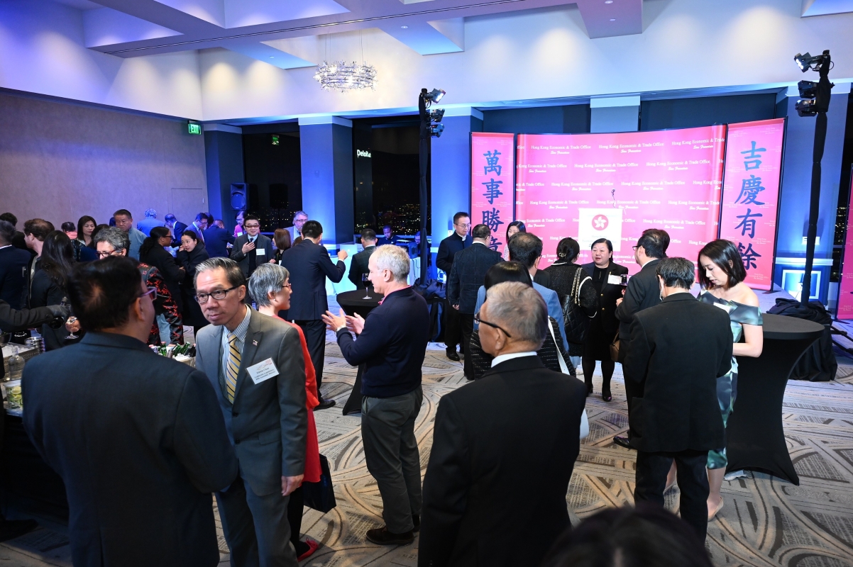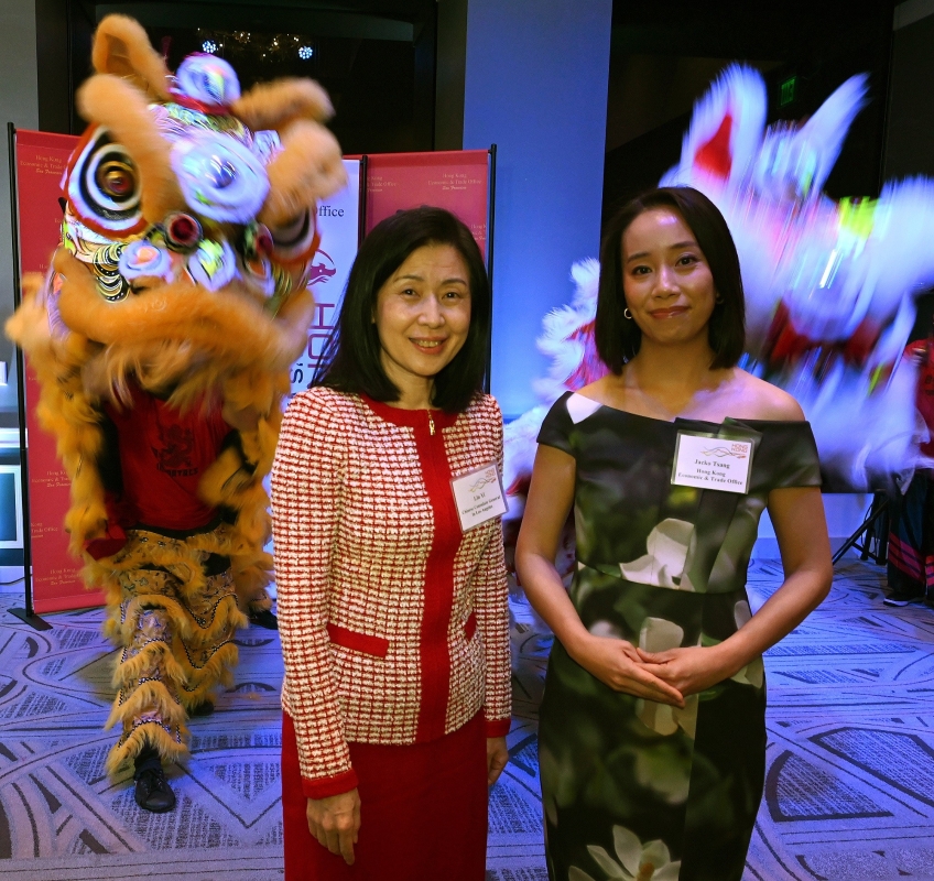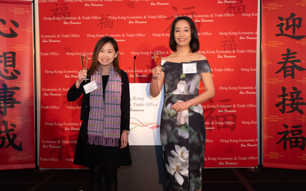 由香港駐三藩市經濟貿易辦事處舉辦的新春酒會獲得加州、華盛頓州及德克薩斯州接近600名嘉賓踴躍出席,包括來自各國領事館、當地政府機構、學術界和商界的代表,以及社群領袖。 香港駐三藩市經濟貿易辦事處處長曾舜雯(右)與副處長吳泳珊(左)2月3日(達拉斯時間)於達拉斯舉行的新春酒會上祝酒迎接兔年。
