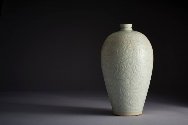 東京中央亞洲巡展:2023年春拍精選 本次巡展亮點之一,包括北宋時期的青白釉刻花纏枝牡丹紋梅瓶。此器整體曲線完美、造型端莊、穩重,釉光晶瑩溫潤。主題紋飾牡丹,是自唐代開始就備受皇帝及達官貴人喜愛的圖騰,更有富貴吉祥的寓意。在雕刻刀工上,線條剛勁、精準。宋代時期,此種器型多為裝酒之用,普稱為經瓶。而“梅瓶”一詞,在許之衡《飲流齋說瓷》中描述:“梅瓶口細而頸短,肩極寬博,至脛稍狹折,於足則微豐,口徑之小,僅與梅之瘦骨相稱,故名梅瓶也。”