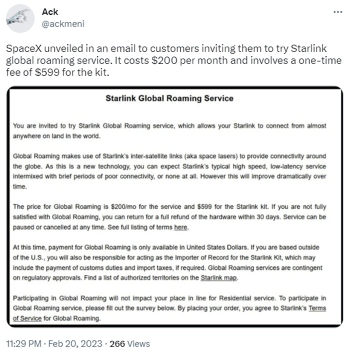香港新聞網2月22日電 據推特網友爆料,SpaceX公司已通過發送電子郵件邀請其客戶試用星鏈全球漫游服務。不過,星鏈的費用與市面上的全球漫游服務相比昂貴很多,并只能通過美元支付。