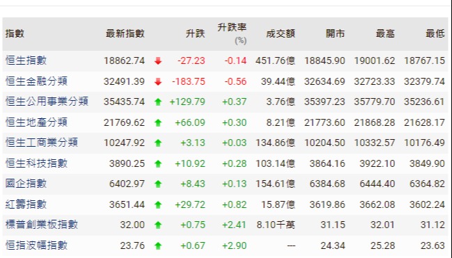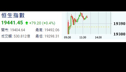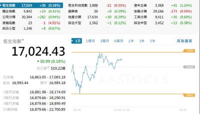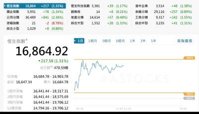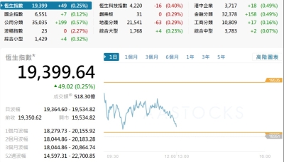 【港股半日速報】恆指半日升110點