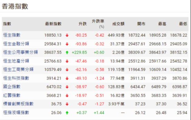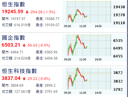 當日,港股低開341點,開報19197點。早段曾跌最多430點,之後跌幅略微收窄。