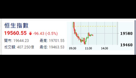 當天早上,恒指低開12點,報20354點,甫開跌35點,報20331點,隨後止跌回升,升94點。