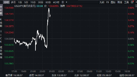 日本央行對本國經濟預估表 日本央行指出,日本經濟不確定性仍極高,經濟增長速度可能在預測期末前放緩。 日元短線急跌 整體而言,日本央行此次利率決議的結果基本符合市場預期。不過有鑒於事前曾有一些鷹派人士猜測,植田和男可能會“偷襲”市場——對YCC政策作出調整,因此在相對更為鷹派的押注落空下,日元今日盤中仍出現了明顯跳水。 行情數據顯示,美元兌日元日內最高一度升至了134.93附近,較決議公佈前的水平飆升了逾100點。