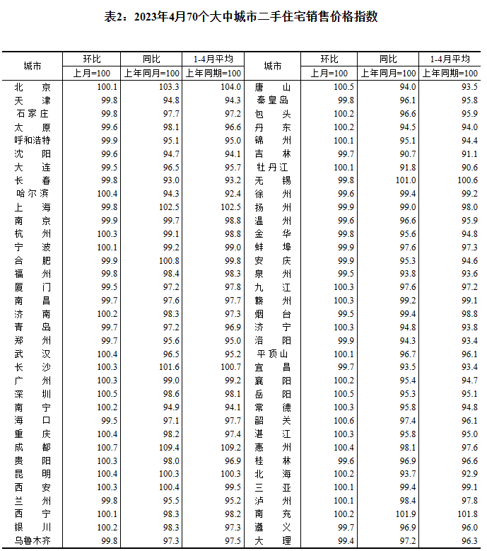 圖源:國家統計局 從二手房看,環比整體漲幅回落更為明顯。4月份,一線城市二手住宅銷售價格環比上漲0.2%,漲幅比上月回落0.3個百分點,其中,北京、廣州和深圳環比分別上漲0.1%、0.3%和0.5%,上海由上月上漲0.7%轉為下降0.2%;二三線城市二手住宅銷售價格環比均由上月上漲轉為持平。