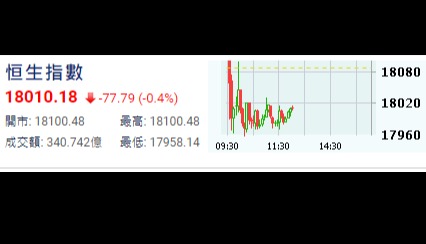 當天早上,恒指低開10點報17803點,曾升44點報17858點,隨後港股受壓,曾跌102點報17711點,午間收市跌幅收窄。