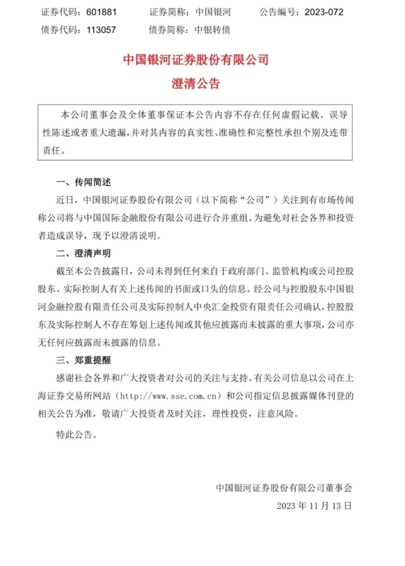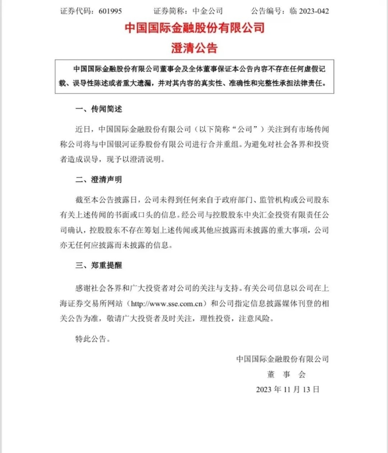 同時,中金公司於11月13日早間發佈公告稱,近日,中國國際金融股份有限公司關注到有市場傳聞稱公司將與中國銀河證券股份有限公司進行合併重組。為避免對社會各界和投資者造成誤導,現予以澄清說明。