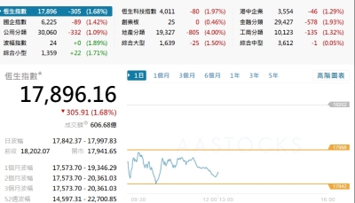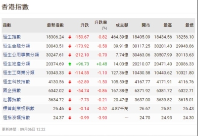 香港新聞網10月8日電 A股8日大幅高開後升幅明顯收窄,港股一度急跌逾2300點,恆生指數半日報21694點,跌1405點。