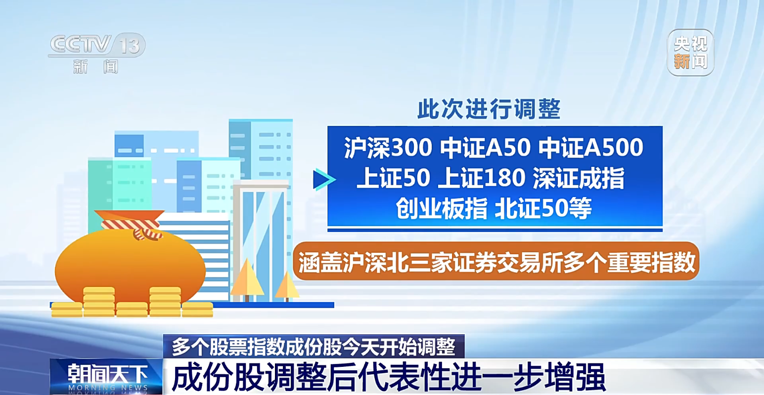央視新聞報道截圖 央視新聞報道,此次進行調整的,包括滬深300、中證A50、中證A500、上證50、上證180、深證成指、創業板指、北證50等,涵蓋了滬深北三家證券交易所的多個重要指數。其中不少指數,都有百億元甚至千億元的配套基金規模,受到投資者廣泛關注。 經梳理發現,體現新質生產力發展方向、引入環境、社會、治理(ESG)可持續投資理念是在基礎的調整規則外,多個指數重點強調的成份股調整方向。(完) 【編輯:丘志彬】