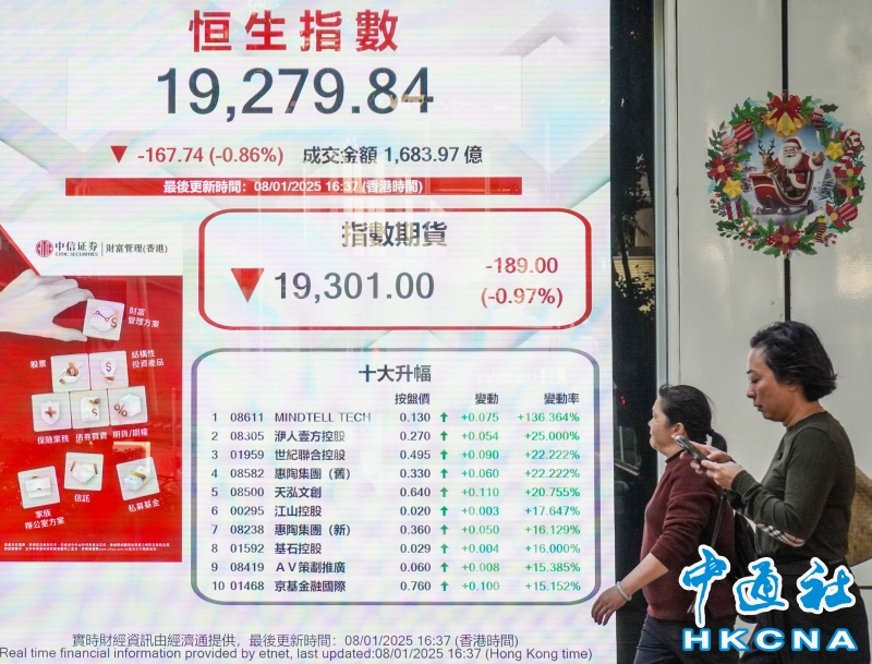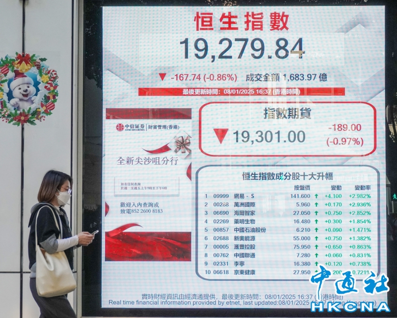 香港恒生指數跌167點 報19279點分享到:
