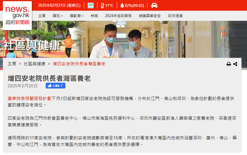 圖源:香港政府新聞網 新增的服務機構包括江門市新會區養老中心、佛山市南海區桃苑福利中心有限公司、深圳市寶安區前海人壽幸福之家養老院、深高速深高樂康健康服務(深圳)有限公司(光明社會福利院)。 連同現時的11家安老院,參與計劃的安老院總數將增至15家,所在的大灣區內地城市將增至6個,包括深圳、廣州、佛山、肇慶、中山和江門。 計劃為正在香港輪候長期護理服務並有意在內地城市養老的長者,提供多一個選擇,政府資助已包括長者在院舍的食宿費用、護理服務及個人照顧費用,以及基本醫療費用。(完) 【編輯:彭玉婷】