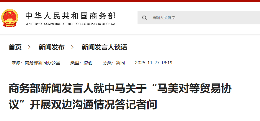 圖源:中國商務部網站截圖 據中國商務部消息,11月25日,中國商務部相關司局與馬來西亞貿工部相關負責人在北京就“馬美對等貿易協議”相關問題開展雙邊溝通。 中方表示,樂見馬方與其他國家通過商簽經貿協議解決分歧。但任何協議不應影響全球貿易發展和區域合作,不得損害中方利益。中方對“馬美對等貿易協議”中的部分內容有嚴正關切。希望馬方從本國長遠利益出發,充分考慮并妥善處理。 馬方就中方關切問題逐項進行了解釋澄清,并表示馬方珍視中馬長期夥伴關係,願繼續深化雙方經貿合作。(完) 【編輯:彭玉婷】