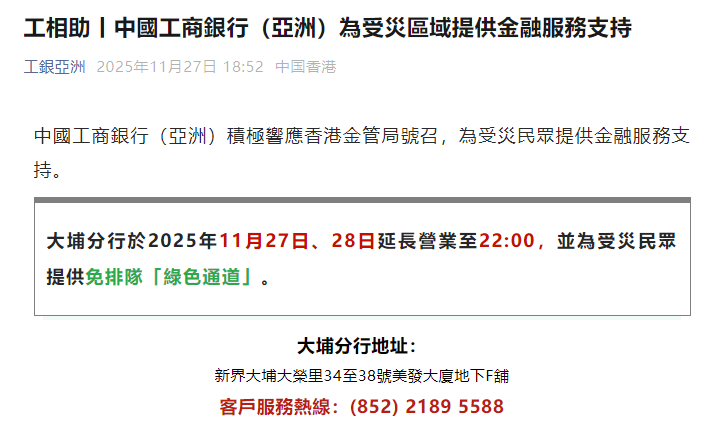 香港新聞網11月28日電 為滿足受大埔火警影響市民在銀行服務方面的急切需求,中國工商銀行(亞洲)宣布,延長大埔分行於11月27日(星期四)及11月28日(星期五)的營業時間。 大埔宏福苑奪命火警牽動人心,香港金管局及銀行公會27日向銀行業界呼籲,為受影響市民提供支援,包括協助相關人士提取流動資金、優先及加快補辦銀行文件、提供延遲還款寬限及豁免罰息和手續費、增加大埔區銀行職員人手,以確保他們及時得到適切的服務。 中國工商銀行(亞洲)積極響應香港金管局號召,為受災民眾提供金融服務支持。中國工商銀行(亞洲)表示,大埔分行27日、28日的營業時間將延長至晚上10時,並設置免排隊“綠色通道”。該行在大埔附近分行及周邊ATM機準備充足現金,均可提供無卡取款服務。