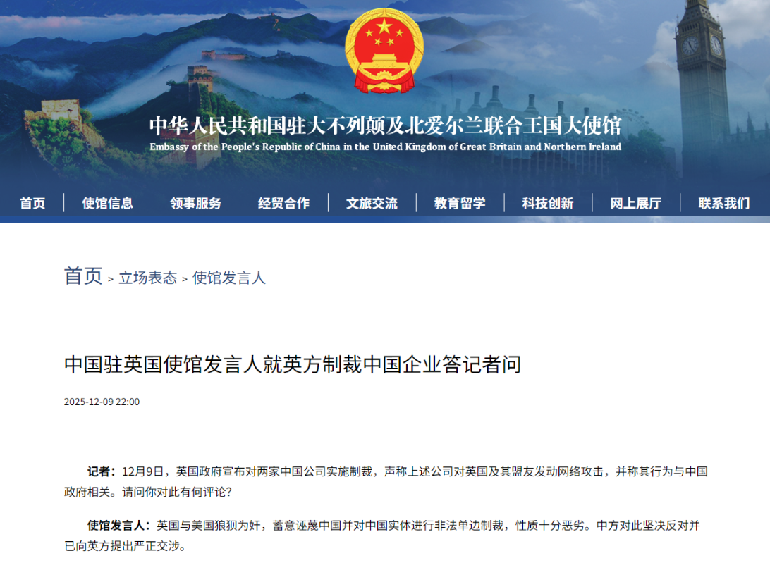 圖源:中國駐英國大使館網站截圖 據中國駐英國大使館官網消息,發言人指出,英國與美國狼狽為奸,蓄意誣蔑中國並對中國實體進行非法單邊制裁,性質十分惡劣。中方對此堅決反對並已向英方提出嚴正交涉。 發言人續指,中方一貫依法打擊各種形式的網絡惡意活動。同時,中方堅決反對把網絡安全問題政治化,反對在沒有事實依據的情況下無端指責他國。中方敦促英方立即糾正錯誤做法,撤銷對中國企業的制裁,停止誣蔑抹黑中國。中方將採取必要措施維護自身合法權益。 據英國政府網站9日所發布的聲明,受到英國制裁的兩家企業分別為四川安洵信息技術有限公司(Sichuan Anxun Information Technology Co. Ltd)和誠信科技集團(Integrity Technology Group Incorporated)。 英方聲稱要嚴厲打擊中國公司在網絡空間的“魯莽和不負責任活動”,這兩家科技公司因“魯莽和無差別網絡攻擊”而受到制裁。(完) 【編輯:彭玉婷】