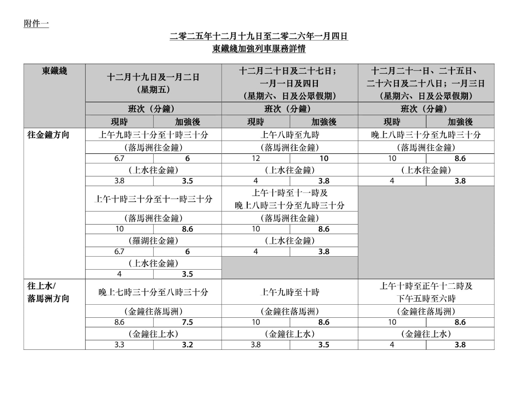 香港新聞網12月19日電 港鐵公佈,即日起至明年1月4日,會加強東鐵線、港島線及迪士尼線列車班次,高速鐵路(香港段)亦會加開來往香港西九龍站及福田站的班次。為方便乘客於聖誕及新年期間出行,在平安夜(24日)及除夕(31日)當日,大部分鐵路線及部分輕鐵線會通宵行駛,並自下午開始加強服務:另外,港鐵會配合除夕羅湖口岸的服務安排,相應地延長當晚東鐵線來往羅湖站的過境列車服務。