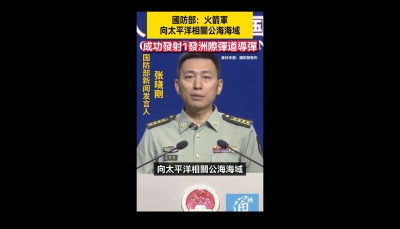 9月25日8時44分,中國人民解放軍火箭軍向太平洋公海海域成功發射一發攜載訓練模擬彈頭的洲際彈道導彈,準確落入預定海域,此次導彈發射,是年度軍事訓練例行性安排,符合國際法和國際慣例,不針對任何特定國家和目標。