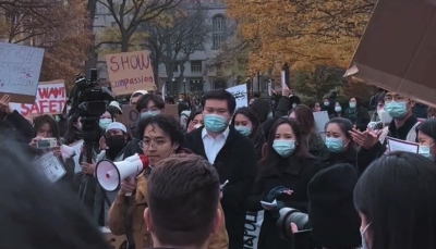 【字幕】11月16日,以中國留學生為主的數百名芝加哥大學學生、教職員以及家長,在芝大校園舉行遊行集會。