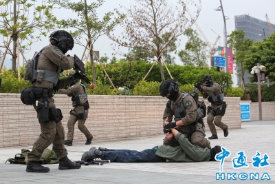【字幕】11月19日下午,香港特區政府海關、懲教署、消防處、飛行服務隊、警務處及入境處組成的跨部門反恐專責組展開反恐演習。