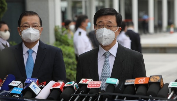 【字幕】香港特區政府前政務司司長李家超於4月12日下午,與其競選辦公室主任譚耀宗共同見記者。李家超表示,目前共爭取了700多張提名票,13日將帶著提名票正式報名參選香港特區第六屆行政長官。
