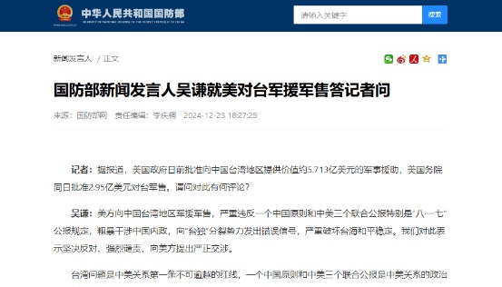 【同期】國防部新聞局局長 國防部新聞發言人 吳謙大校 台灣是中國的台灣,台灣問題純屬中國內政,不容美方幹涉。一段時間以來,美方說一套、做一套,一方面說堅持一個中國政策,不支持“台獨”,一方面強化與中國台灣地區的軍政勾連,出售台武器計劃,這種玩火行徑非常危險,將嚴重沖擊中美兩國兩軍關係,嚴重危害台海地區和平穩定,嚴重推高中美軍事對抗風險。 統一祖國、製止分裂,是中國人民解放軍的神聖使命。我們將一如既往,對“台獨”零容忍,打“台獨”不手軟,堅決捍衛國家主權和領土完整。 記者 付鈺香港報道 |