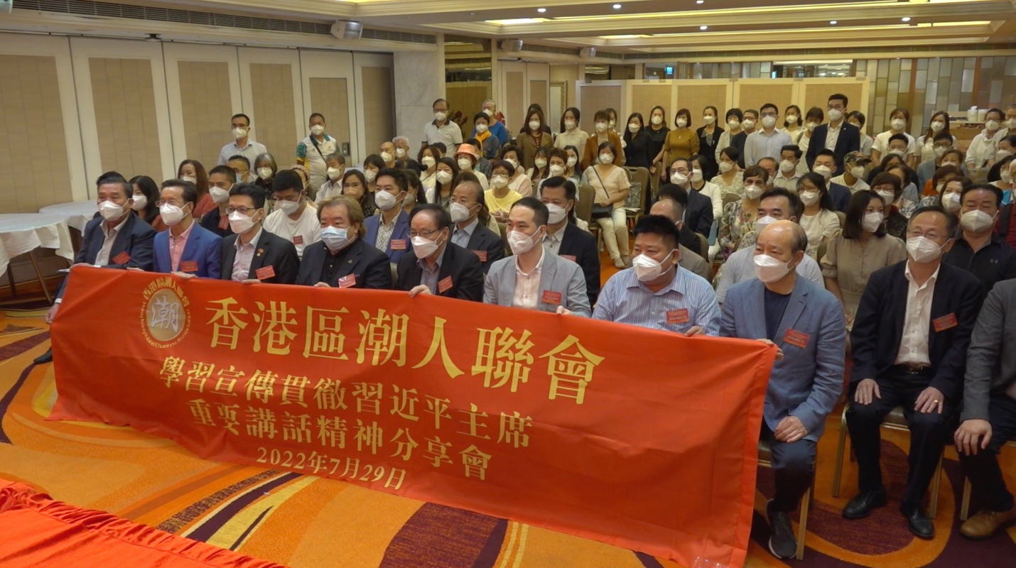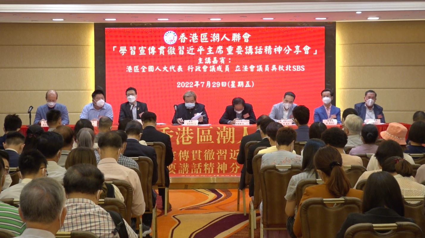 【字幕】為進一步貫徹落實習近平主席重要講話精神,香港區潮人聯會於7月29日舉辦“學習宣傳貫徹習近平主席重要講話精神分享會”。港區全國人大代表葉國謙,香港立法會議員吳秋北出席本次活動,共一百多人參加。