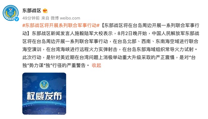 8月4日13時許,中國人民解放軍東部戰區陸軍部隊,在台灣海峽實施了遠程火力實彈射擊訓練,對台灣海峽東部特定區域進行了精確打擊,取得了預期效果。