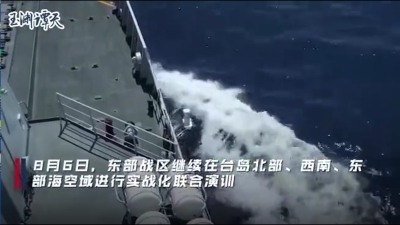 【字幕】8月6日,中國人民解放軍東部戰區按計劃,繼續在台島北部、西南、東部海空域進行實戰化聯合演訓。在戰區聯合作戰體系支撐下,戰區海軍出動艦艇、戰機、岸導等任務兵力,重點進行了聯合對陸打擊、對海突擊等課目訓練。