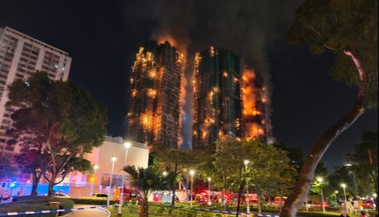【字幕】香港大埔宏福苑11月26日突發火警,火勢迅速蔓延波及屋苑七座住宅,至下午6時22分升為五級火,入夜後現場多棟大廈仍陷入火海、冒出濃煙。記者27日早晨在現場看到,大火已受控制,但仍有個別房間有火光未滅。截至清晨6時,火警至今造成44死58傷,死者包括一名殉職消防員。