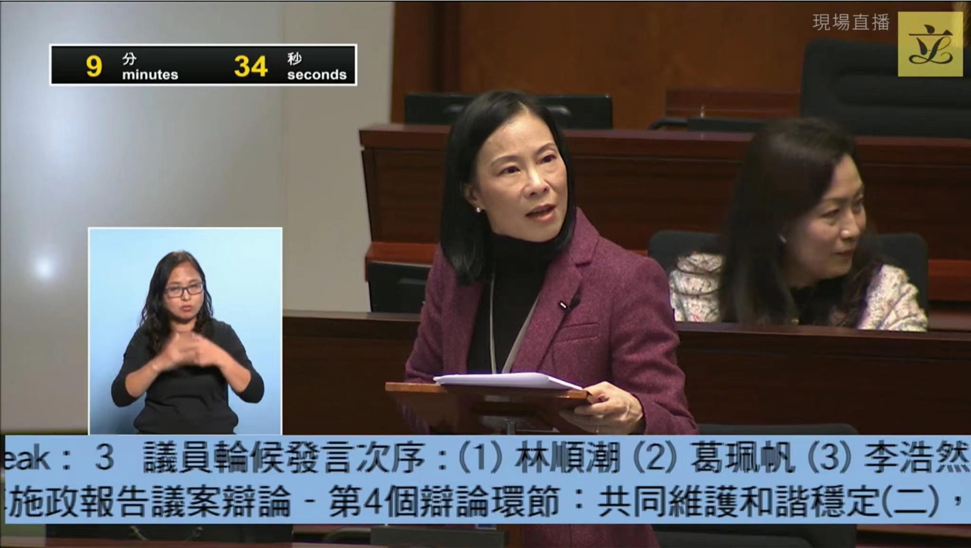 本人11月24日在立法會會議《施政報告》議案辯論中發言,並對施政報告表示支持、肯定和認同。 本人非常感謝政府設立“婦女事務專員”一職,這是眾姐妹們長期爭取的成果,亦都回應本人於今年5月提出並獲通過的議案。關於推動婦女發展,本人提出兩點建議,第一,政府盡快落實“香港女性全面發展藍圖”,為女性長遠發展事業提供可落實的願景,確立制度、資源、時間表和路線圖;第二,借助內地資源,推動本地婦女團體與大灣區女子學院合作。