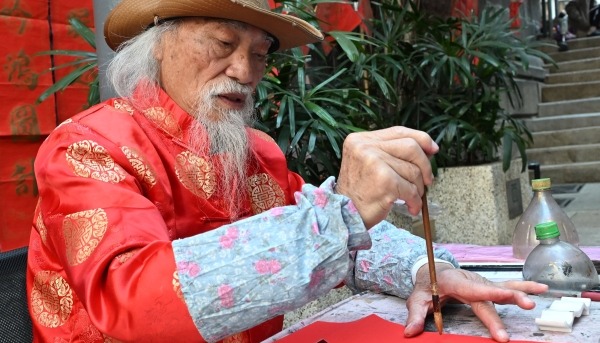 是不是其實想要找女朋友都會有詞寫? 【同期】嘉賓 郭先生 應該有的,如果是找女朋友的話主要就是【心想事成】,代表兩心相知,你寫其他的都是沒有什麼用的。 【解說詞】 在香港有條全都以樓梯組成的街道,是名副其實的【樓梯街】。樓梯街在1841年至1850年間興建而成,在上環一帶沒有一條樓梯長得過它,總共有316級咁多。 農曆新年將至,【樓梯街】就搖身一變變成了揮春街,街上的手寫揮春的檔口陸續開檔,一張張大紅揮春貼到成條樓梯都是,為這條百年老街換上了紅噹噹的新裝,亦是農曆新年前才難得一見的景象,喜氣洋洋迎接虎年的到來。 【同期】主持人 通仔 哈嘍各位觀眾大家好,新年就快到了,大家都知道中國人的傳統會寫揮春,寫揮春的意思就是將好運,好意頭帶回家。通仔今天都來到上環的樓梯街,就聽說這裡有一位老先生在這裡寫了很久揮春,很受附近的街坊歡迎,我們就來到這裡拜訪一下他。 【同期】主持人 通仔 哈嘍郭先生你好,今天很高興來到這裡看您寫揮春,您為什麼會選擇在樓梯街這裡寫揮春? 【同期】嘉賓 郭先生 我希望能夠我的興趣有多些人學,尤其BB仔,小學生,如果(他們)有興趣學習中文字的話,我希望自己能夠盡一分力。小孩子上學放學的時候對中文字有認識,令他們有興趣去學習。 【同期】主持人 通仔 郭先生我們今天看到你的桌子上擺放了很多工具,我們看到這些字的顏色都是有一些不同的,可不可以和我們簡單介紹一下(你寫字)的工具。 【同期】嘉賓 郭先生 就是因為不同大小的字型,當然要用不同大小的毛筆。 【同期】主持人 通仔 金油和墨水有什麼不同? 【同期】嘉賓 郭先生 金油就是比較顯眼一些,比較搶眼一些,同時比較新鮮一些,由於他們都是一個化學作用,也是有時間限制的。有些是金色的,有些是墨色的。有些人希望做一些不同於傳統概念的,就用金色,比較醒目,有些希望比較傳統一些的,能夠擺的久一些,就用黑色的。 【同期】主持人 通仔 會不會在過年的時候就會有一些人來寫揮春?會不會比平常的人更多一些? 【同期】嘉賓 郭先生 如果從中國的傳統裡面來講,他們都希望新年有一個新的氣象,同時有一個新的期望。所以他們在新年的時候都會有一些祈求,所以他們就可能會有興趣來這裡寫揮春。 【同期】主持人 通仔 其實我自己都會帶著少少的期望,今天來到這裡想要請您寫幾個字,希望新一年自己的願望可以達成。看到你寫了很多不同的揮春,後面也有很多,其實(我)都很想知道是不是會有很多不同的種類。因為我們看到有些方形的,有些長方形的,還有一些更長的,這幾種的話是不是會有些不同? 【同期】嘉賓 郭先生 譬如說我今天現在寫的這種是長條形的,它並沒有很大的要求,只不過是將自己的心願體現在文字上,或者是家裡的需要。譬如說以往方形的就是寫一個【福】字。我今年提供給朋友們的就是【喜氣臨門】。在傳統裡面就是拿一個【福】字,從實際上講【喜氣臨門】,開心就是【喜氣臨門】。 【同期】主持人 通仔 我們看到您都有寫一些廣東話的對聯 【同期】嘉賓 郭先生 (廣東話對聯)比較傳神一點,比如說有一個【虎躍龍門跨鳳閣,鳳生龍子躍龍門】。大約五十年前,我同學結婚的時候,不知道哪一個高手就為他們寫了這一個【虎躍龍門跨鳳閣,鳳生龍子躍龍門】。它的意思大概就是,長江後浪推前浪。世上新人換舊人。就是這個意思。一路不斷地進取。 新年快到了,通仔在這裡提前祝大家新年進步,也祝大家可以像我這幅字寫的一樣,可以“心想事成”。 |