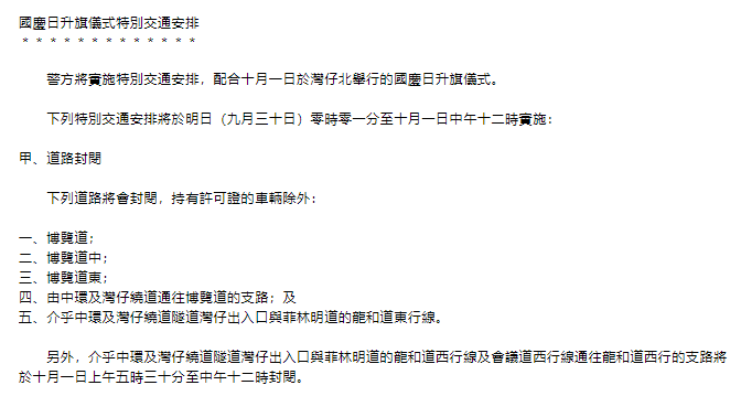 為配合國慶日升旗儀式,港警將實施特別交通安排分享到:
