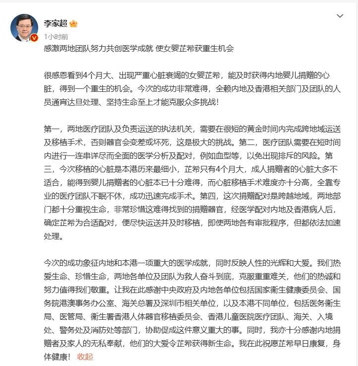李家超微博截圖 李家超指出,第一,兩地醫療團隊及負責運送的執法機關,需要在很短的黃金時間內完成跨地域運送及移植手術,否則器官會變差或壞死,這是極大的挑戰。第二,醫療團隊需要在短時間內進行一連串詳盡而全面的醫學分析及配對,例如血型等,以免出現排斥的風險。第三,今次移植的心諟是香港歷來最細小,芷希只有4個月大,成人捐贈者的心諟大多不適合,能得到嬰兒捐贈者的心諟本已十分難得,而心諟移植手術難度亦十分高,全靠專業的醫療團隊不眠不休,成功迅速完成手術。第四,這次捐贈配對是跨越地域,兩地部門都十分重視生命,非常珍惜這難得找到的捐贈器官,經醫學配對內地及香港病人後,確定芷希為合適配對,便盡快運送并及時移植,即使兩地各有審批程序,但都依法加速處理。 李家超表示,今次的成功象征內地和香港一項重大的醫學成就,同時反映人性的光輝和大愛。我們熱愛生命、珍惜生命,兩地各單位及團隊為救人奮鬥到底,克服重重難關,他們的熱誠和努力值得我們敬重。讓我在此感謝中央政府及內地各單位包括國家衞生健康委員會、國務院港澳事務辦公室、海關總署及深圳巿相關單位,以及本港不同單位,包括醫務衞生局、醫管局、衞生署香港人體器官移植委員會、香港兒童醫院醫療團隊、海關、入境處、警務處及消防處等部門,協助促成這件意義重大的事。同時,我亦十分感謝內地捐贈者及家人的無私奉獻,他們的大愛令芷希獲得新生命。我在此祝願芷希早日康複,身體健康! 【編輯:王瑶】