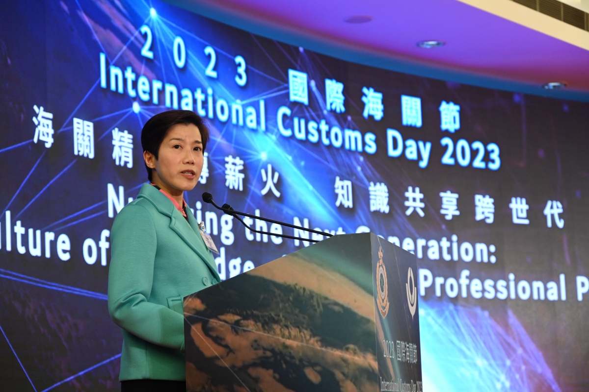 政務司司長陳國基於典禮上致辭 何珮珊在致辭時以“國際海關節”主題中“知識管理”和“以海關專業為榮”這兩個元素,闡述香港海關培養年青海關人員的工作,讓年輕一代發揮嫻熟運用科技的技巧,並回應他們對認同感的追求。一系列相關工作包括深化嶄新科技的應用,以促進部門內的知識交流;廣納年輕人員參與決策,以加強他們的歸屬感和主人翁意識;以及擴大海外和本地借調機會,以培養他們的自豪感和增長見識。