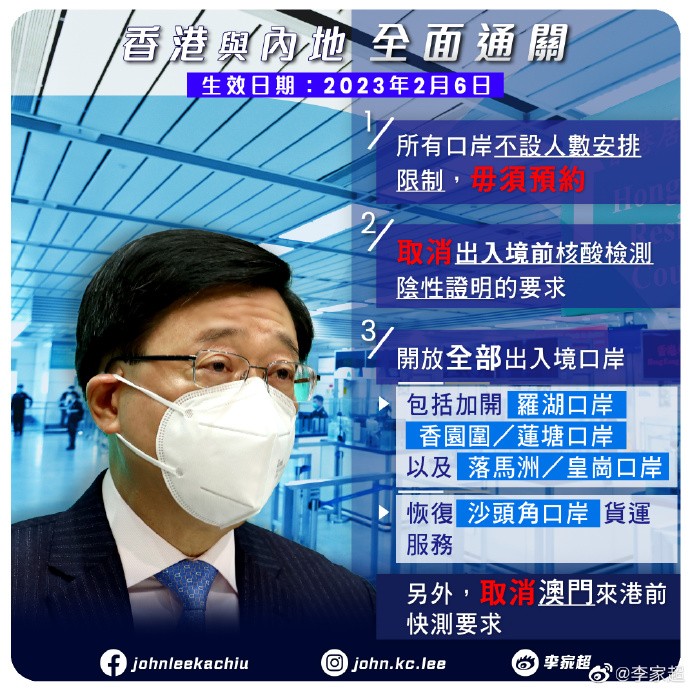 香港新聞網2月3日電 國務院聯防聯控機制今日(3日)宣布,由下周一(2月6日)起全面恢復內地與港澳人員往來,經粵港陸路口岸出入境毋須預約,且不設限額;自港澳入境內地人士,如7天內沒有外國或其他境外地區旅居史,毋須核酸檢測。香港特首李家超今日在社交媒體發文,表示香港與內地下周一(2月6日)起將全面、全開放通關,出入境前均毋須做核酸檢測,開放全部出入境口岸,所有口岸不設人數限制,毋須預約。相信香港和內地全面通關,將全面進一步提振人文交流、經濟活動。