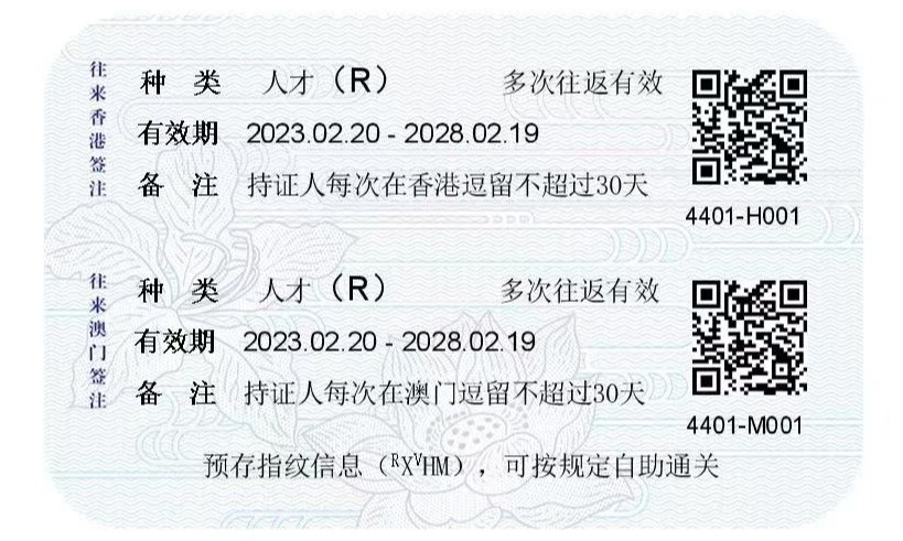 往來港澳人才簽注式樣 在新措施下,符合內地當局訂定的資格的六類人才可以向內地當局申請有效期5年、3年或1年的人才簽注,在簽注有效期內多次往來香港,每次在香港逗留不超過30天。相較目前的商務簽注的7天逗留期限,人才簽注將大大提高合資格高端人才訪港的便利性。如持人才簽注的人士同時符合較早前特區政府在2023年2月1日起擴展的“為來港參與指定界別短期活動的訪客提供入境便利先導計劃”,亦可以訪客身分在港參與指定短期活動而無須申請工作進入許可。 人才簽注的推出正值香港與內地全面通關,措施有助促進大灣區內人才互動,為香港以至整個大灣區注入更大的發展動能,達至互利雙贏。 根據現行安排,訪港內地居民必須持有有效的《往來港澳通行證》(俗稱《雙程證》)及相關赴港簽注。《往來港澳通行證》及赴港簽注的受理、審批及簽發屬內地當局的職權範圍。符合內地當局訂定資格可申請人才簽注的六類人才為傑出人才、科研人才、文教人才、衞健人才、法律人才及其他人才。新措施促進香港進一步融入國家發展大局,便利人才在香港匯聚交流,為進一步推動大灣區建設發展取得實質的成果,特區政府會繼續與內地當局保持緊密溝通,以期在此良好的基礎上進一步推進大灣區人才交流和互動。 (完) 【編輯:黃璇】