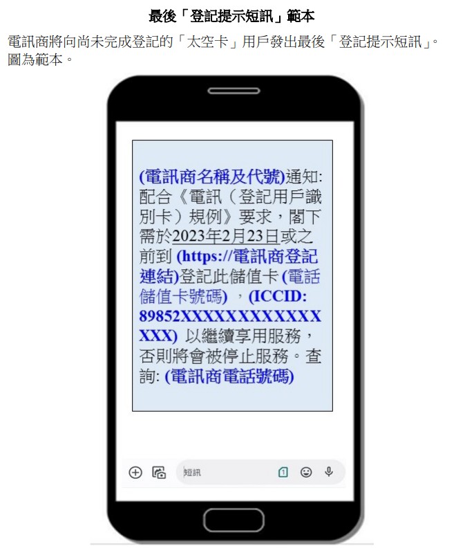 最後“登記提示短訊”範本 一如電訊商以往發出的提示短訊,最後“登記提示短訊”經指定發送者名稱“SIMREG”發出,當中會列出所屬電訊商資料、“太空卡”電話號碼、SIM卡卡號(即ICCID)及登記途徑等相關資訊。相關用戶可按短訊內的超連結,或透過所屬電訊商的網頁或流動應用程式於限期前提供香港身份證上的資料(包括中英文姓名、出生日期、香港身份證號碼及副本),即可完成登記。 如需協助,可到所屬電訊商門市或18間指定郵政局設立的服務櫃位尋求協助。相關郵政局的服務櫃位今、明兩日將延長服務時間至晚上7時,以處理限期屆滿前可能急增的求助個案。政府設於全港25個指定港鐵站的支援服務站今、明兩日會繼續於上午9時至下午6時協助有需要的“太空卡”用戶透過其智能手機進行登記。 為確保舊有“太空卡”的實名登記於限期前順利完成,政府與電訊商成立的專責應變協調小組於本周初舉行會議,商討各項應變方案,以妥善處理登記限期前後可能出現的各種突發情況。會上,各電訊商均表示會積極配合要求,投入額外資源及人手,包括延長門市和客戶服務熱線的服務時間,靈活調配資源加強其客戶支援服務,並已制定應變方案確保客戶的“太空卡”能順利完成實名登記。小組會密切監察登記期限前後的情況,在有需要時作出迅速有效的應變協調。 除現有一系列多元化的宣傳外,政府已透過社福機構、地區組織和銀行等再次提醒相關用戶登記,並經港台電視31及32、電台頻道及電話智能卡實名登記制專題網站(www.ofca.gov.hk/simreg)發放限期倒數提示信息。 如欲獲取更多有關電話卡實名登記的資訊,可瀏覽專題網站(www.ofca.gov.hk/simreg)或致電通訊事務管理局辦公室熱線(+852 2961 6699)。(完) 【編輯:黃璇】
