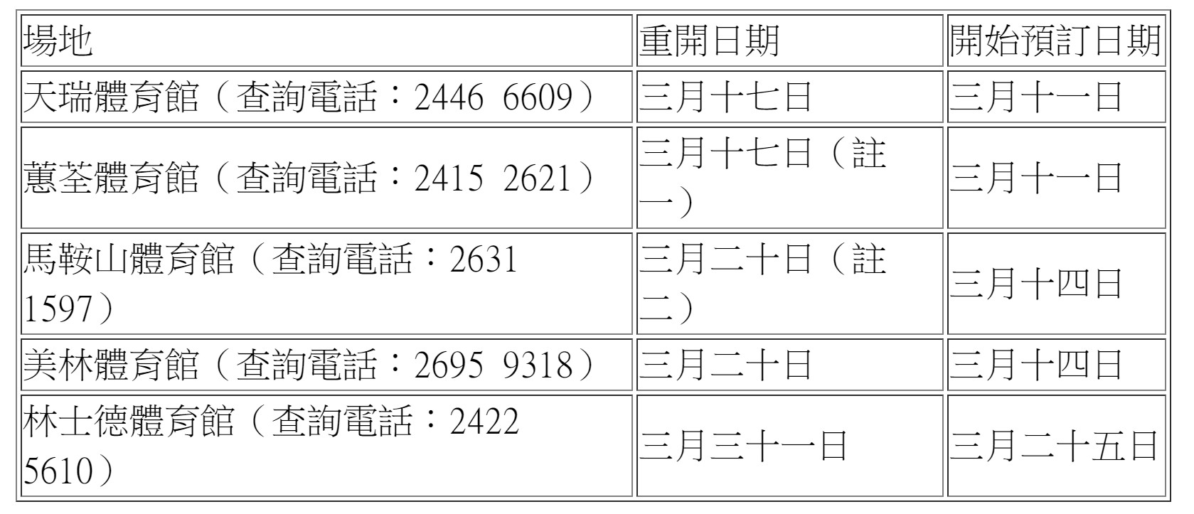 香港新聞網2月23日電  康樂及文化事務署轄下五個體育館於3月17日(星期五)起將陸續向公眾重新開放。這些場地早前暫停開放以用作防疫用途。市民可於以下開始預訂日期起,使用康體通網上預訂服務、現正開放場地的訂場櫃枱及自助服務站,或於當日起在辦公時間內到各分區康樂事務辦事處的訂場櫃枱預訂以下場地的重開收費設施: