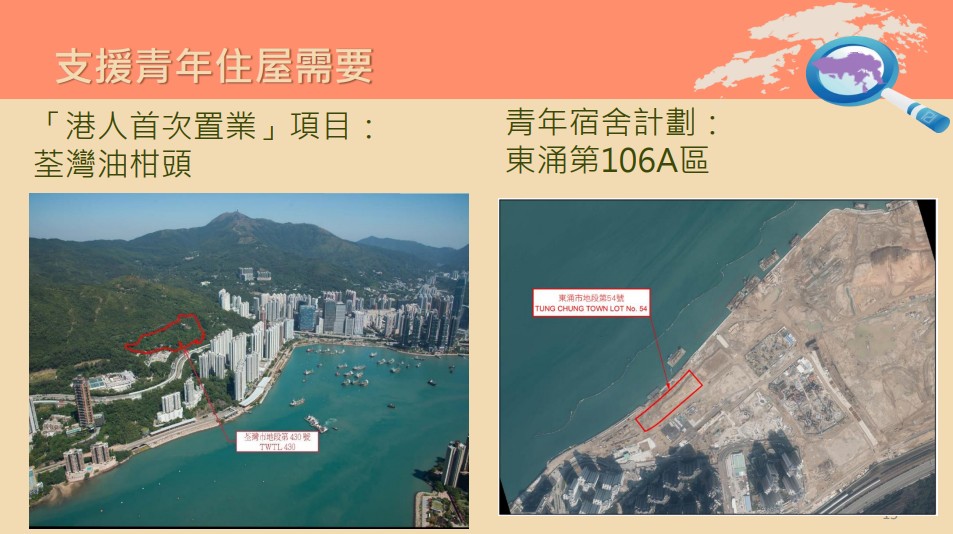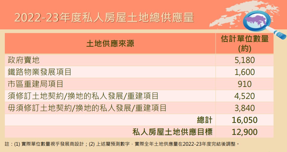 2023至24年度賣地計劃 住宅用地方面,除可供推售的12幅用地外,鐵路物業發展項目及市區重建局(市建局)項目亦是2023至24年度私人房屋土地供應的來源。香港鐵路有限公司(港鐵公司)計劃在下年度推出小蠔灣第一期和第二期,以及東涌東站第一期的住宅發展項目。3個鐵路物業發展項目預計可提供約共4,530個單位。另外,市建局計劃推展3個項目,分別是九龍城盛德街/馬頭涌道、啟德道/沙浦道及黃大仙衙前圍村,預計可提供約2,200個單位。私人發展/重建項目方面,參考過去10年的供應數字,預期2023至24年度的供應約為4,700個單位。 計及來自政府賣地、港鐵公司、市建局,以及私人發展/重建項目的土地供應,2023至24年度私人房屋土地潛在供應估計可供興建約20,550個單位。 根據政府去年10月公布的《長遠房屋策略》2022年周年進度報告,未來10年的房屋供應目標為43萬個單位,公私營房屋比例維持“七三比”,2023至24年度的私人房屋土地供應目標為12,900個單位。惟實際私人房屋土地供應量,會視乎不同因素而有所改變,包括市場情況、可供推售的政府用地的相關程序可否按時完成、鐵路物業發展項目及市建局項目的推展進度,以及發展商推展私人發展/重建項目的意願和進度。政府表示有信心來自不同來源的私人房屋土地供應,可超越下一個財政年度的私人房屋土地供應目標。 去年《施政報告》中提及在下一個財政年度物色合適土地分別用作“港人首次置業”(“首置”)項目和支援“青年宿舍計劃”。甯漢豪表示,發展局及房屋局已選定荃灣油柑頭用地作“首置”用途,預計可提供約1,950個單位,並計劃在2023至24年度第一季推售用地。房屋局現正制定該“首置”項目的發展模式、發展參數及其他詳情,稍後會公布。 至於“青年宿舍計劃”,發展局與民政及青年事務局(民青局)已選定東涌東第106A號用地加入“青年宿舍”元素。政府會在賣地條款要求投得用地的發展商在興建住宅單位外,亦須興建青年宿舍單位以及政府訂明的設施,預計這些宿舍和相關設施不會超過項目總樓面面積的10%。這10%的樓面面積不會計入有關土地可容許的最高樓面面積。民青局正在擬定項目細節,待用地稍後推出時公布。 回顧2022至23年度的私人房屋土地供應,甯漢豪說︰“政府在財政年度完結時已售出8幅住宅用地,合共可供興建約5,180單位。透過政府賣地、鐵路物業發展項目、市建局項目,以及私人發展/重建項目,2022至23年度至今的私人房屋土地整體供應估計可供興建約16,050個單位,超過本年度的供應目標兩成半。”