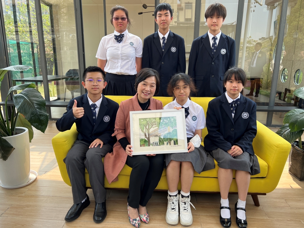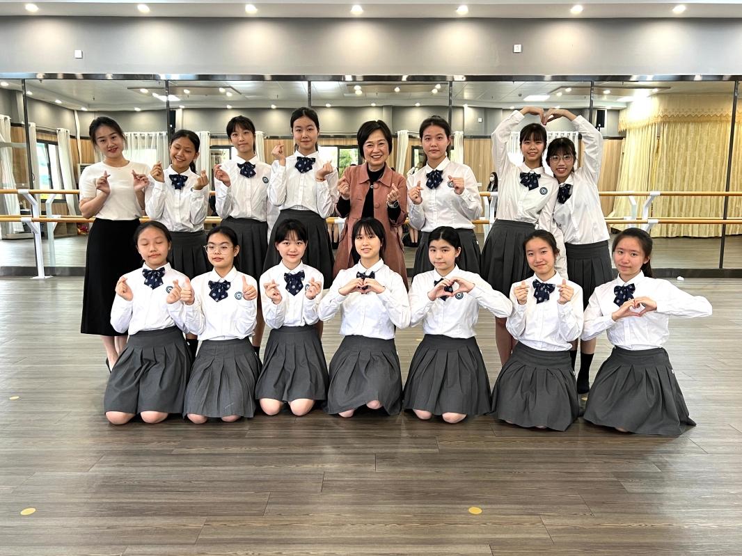 蔡若蓮(前排右五)與東莞暨大港澳子弟學校校長及師生合照 她欣悉兩校配合粵港澳大灣區的發展,提供學前至高中15年一貫制課程,便利港人子女在區內城市就學。